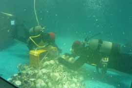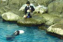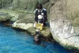 スタッフがドライスーツを着てプールに入り、ガラス面の汚れを拭いたり、底に沈んでいる貝殻を拾い集めたりしました。