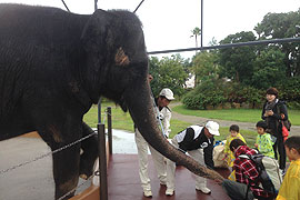 アジアゾウは、お客様に手伝っていただき、鼻の長さと足の裏の大きさの測定を行いました。