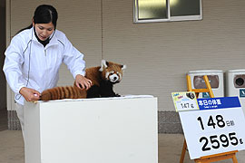 雨天のため、予定していたレッサーパンダのふたごの赤ちゃんの初対面はできませんでしたが、お集まりいただいたお客様の前で、オスのレッサーパンダの体重と体長の測定を行いました。