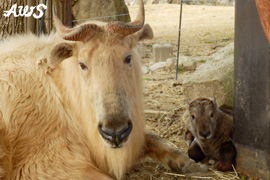 特徴:偶蹄目ウシ科ターキン属 標高の高い山で暮らす。草や竹などを食べる。全身長い体毛に覆われ金色をしていて、名前の由来にもなっています。