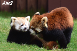 スタッフに抱きかかえられて登場したレッサーパンダの赤ちゃんは、芝生に置かれるとすぐに母親のおなかの下に潜り込み、集まった多くのお客様に少し驚いた様子でした。徐々に運動場に慣れ、生まれて初めてとなる木のぼりにも挑戦し、おぼつかない足取りではありましたが、見事にのぼることが出来ました。