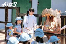 大きく開いたカバの口の中を観察したり、大きな歯ブラシで歯を一本一本丁寧に磨いていただきました。