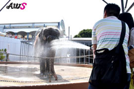 本日(7/22)大暑の日にちなみ、アジアゾウに日頃の感謝の気持ちを込めて特別イベントを実施しました。まず、お客様からアジアゾウに水をかけていただく「シャワー」のプレゼント!そして大きな氷の器に盛られた「かき氷」を贈りました。かき氷はお客様によって色とりどりのフルーツで飾られました。