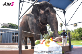 6種約25個のフルーツが乗ったかき氷をあっという間に食べたアジアゾウ。夏の暑さも吹き飛ぶ豪快な食べっぷりを見せてくれました。