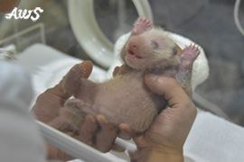 ジャイアントパンダの赤ちゃん(9月18日生まれ・メス)のばんざいをしているような可愛らしい姿。