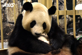 ジャイアントパンダの赤ちゃんは腕の力も強くなり、自分で頭を持ち上げる回数が増えてきました。お母さんパンダ「良浜(らうひん)」の腕の中でも小さな体を力いっぱい動かします。