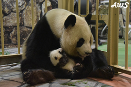 お母さんパンダ「良浜(らうひん)」の腕の中でも活発に動く赤ちゃん。