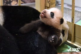 眠そうなお母さんパンダ「良浜(らうひん)」とは反対に元気いっぱいのパンダの赤ちゃん。寝たらつまらない!とばかりにお母さんの腕の中から出ようと一生懸命に小さな手足を動かしていました。