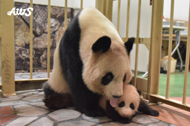 ジャイアントパンダの赤ちゃん「結浜(ゆいひん)」は今日も元気いっぱいです。お母さんパンダ「良浜(らうひん)」は、なんとかして結浜を寝かしつけようとしますが、結浜はまだまだ遊び足らない様子。最後にはお母さんも根負けして親子仲良く遊んでいました。