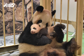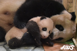 ナイスキャッチ「良浜(らうひん)」!生後3か月をむかえたパンダの赤ちゃん「結浜(ゆいひん)」は、お母さんパンダ良浜のおなかの上でも元気いっぱいに動きまわります。体も大きくなった結浜を落とさないようにと、良浜は一生懸命結浜を抱きかかえます。