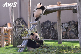 今日もあたたかな太陽の光を浴びて、楽しそうに遊ぶパンダの赤ちゃん「結浜(ゆいひん)」。遊具の最上部までぐんぐん登っていく元気いっぱいな結浜をお母さんパンダ「良浜(らうひん)」はいつも優しく見守っています。