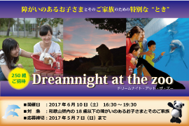 ドリームナイト・アット・ザ・ズーは、毎年6月の第一金曜日の夜に、障がいのあるお子さまとそのご家族を動物園・水族館に招待し、気兼ねなく楽しいひと時を過ごしてもらうための国際的なプログラムです。1996年にオランダのロッテルダム動物園が小児癌を患っている子どもたちとそのご家族を招待したことから始まりました。世界で38か国、271施設で実施されています。