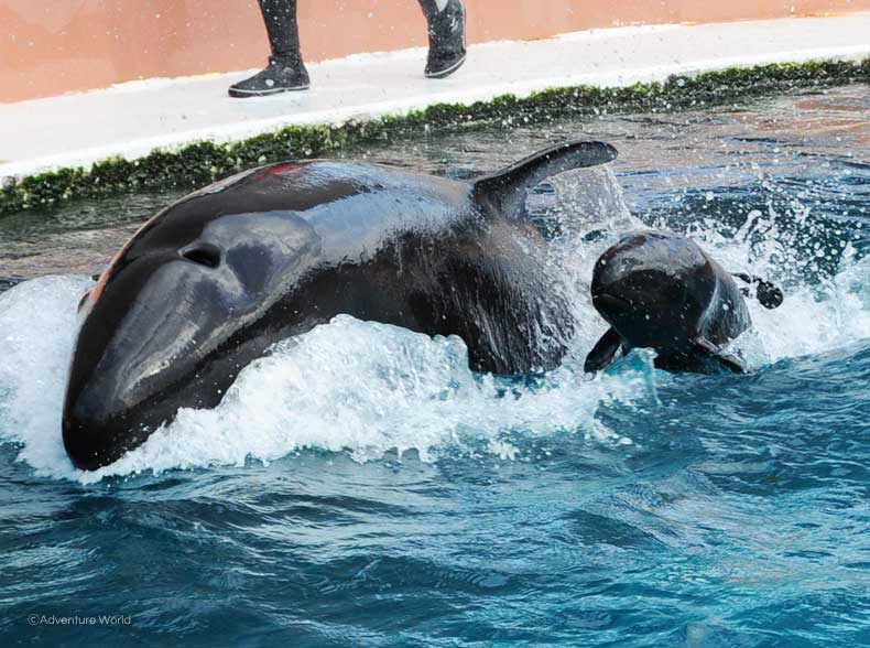 2017年8月15日(火)に誕生したクジラの仲間 オキゴンドウの赤ちゃんは、母親からの授乳が見られないため、親子でバックヤードプールに移動し、人工乳を与えて育成サポートをしております。