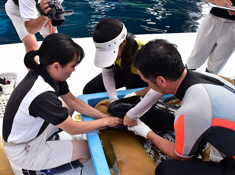オキゴンドウの赤ちゃんは、生後元気に母親と過ごしておりましたが授乳が見られないため、8月19日(土)親子をバックヤードに移動し、人工乳を与え育成サポートしておりました。