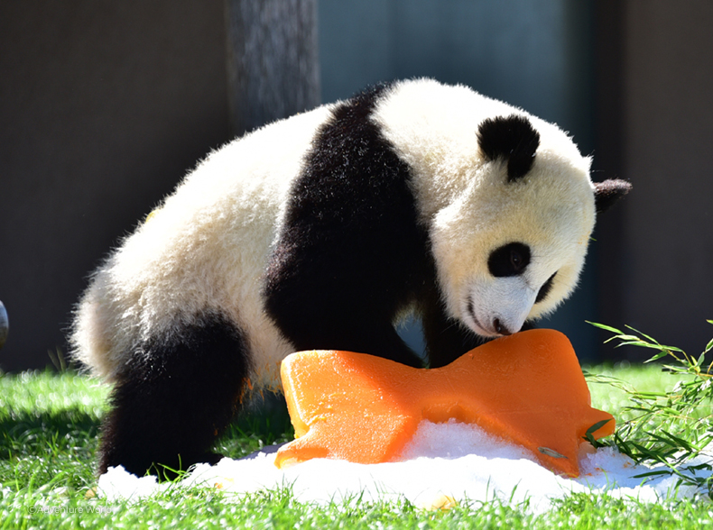 9月18日(月)、パンダの赤ちゃん「結浜」の誕生会を開催しました。雪で「結浜」の顔をかたどって作ったバースデーケーキと氷で作った「1」をプレゼントしました。