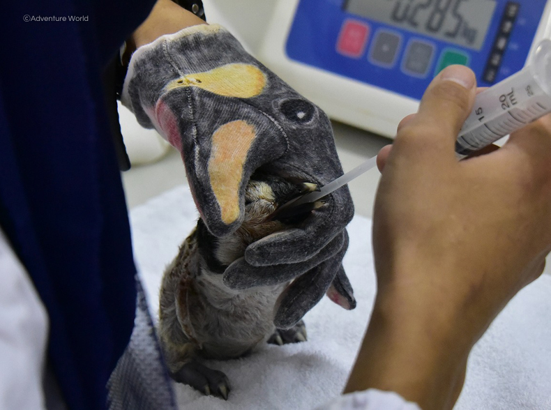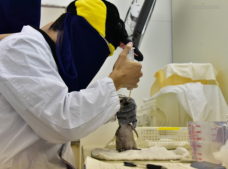 アドベンチャーワールドでは、11羽目となるエンペラーペンギンが2017年10月2日(月)に誕生しました。今回誕生した赤ちゃんは誕生予定日を過ぎても自力で殻を破り出ようとせず、これ以上待つのは危険と判断し、スタッフの手によって殻を1枚1枚取り除き、ようやく誕生しました。生まれてから2日間はあまり動かず鳴くこともない状態でしたが、スタッフのサポートにより、徐々にエサをねだり力強く鳴くようになりました。