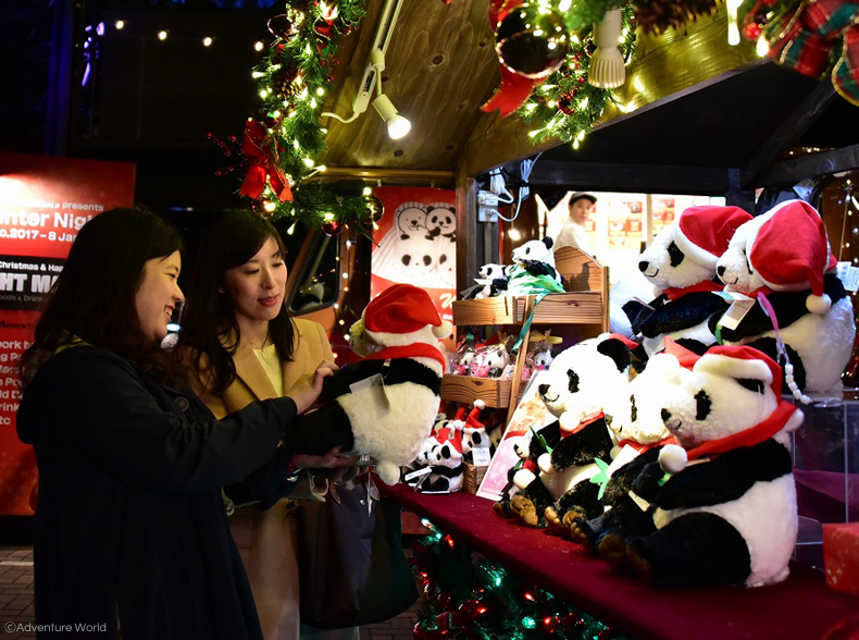 アドベンチャーワールド(和歌山県白浜町)は、冬の夜をお楽しみいただくために、1月8日(月・祝)までの期間限定で、スペシャルイベント『ウィンターナイト』を今年初開催しています。ウィンターナイト中央エリアでは、イルミネーションで飾られた大きなクスノキを中心に、あたたかい料理や限定グッズが揃う屋外マーケットが並びます。オリジナルの「パンダおでん」やスープなどで身も心もあたたまります。