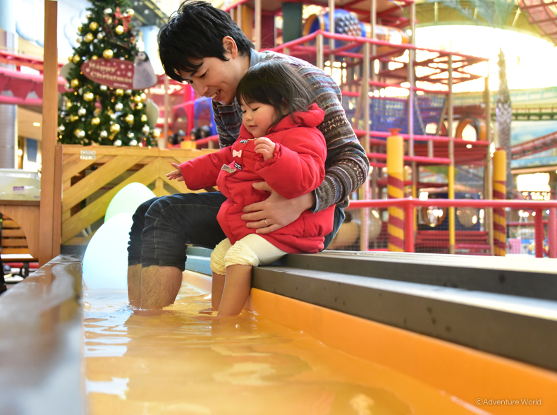 エンジョイドーム内広場「E-ring」に日本三古湯の一つ「白浜温泉」の本格的な天然温泉源泉(藤の湯)を使用した足湯が登場!2018年1月8日(月・祝)まで、ご入園者は無料でご利用いただけます。パークを思いっきり楽しんで、ホッと一息つきたいときにおすすめです。