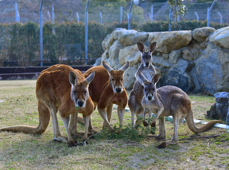 2018年2月5日(月)に熊本市動植物園よりアカカンガルー3頭(オス1頭・3歳、メス2頭・1歳)が仲間入りし、これまで暮らしていたオス1頭と合わせ、4頭の群れで生活する姿をご覧いただけるようになりました。