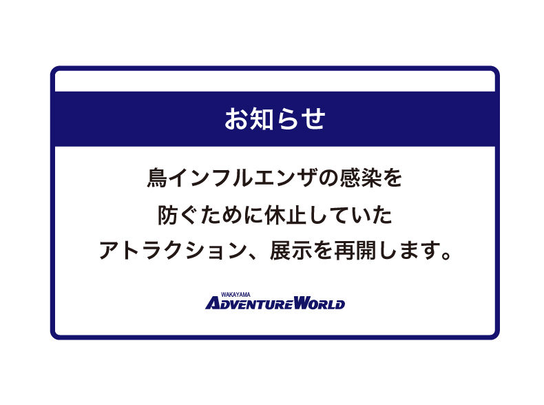 平成30年3月25日以降、鳥インフルエンザの発生が国内で認められておらす、感染の危険性が極めて低い状態と判断し、4月19日(木)に下記のアトラクション、展示を再開し、対策を全面解除いたします。