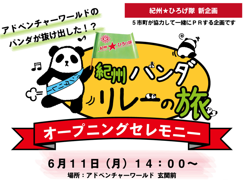■内 容:セレモニーでは、紀州(田辺市、白浜町、上富田町、すさみ町、みなべ町)の代表の方が各市町の魅力をPRしながらリレーセットをバトンし、「紀州パンダリレーの旅」がスタートします。