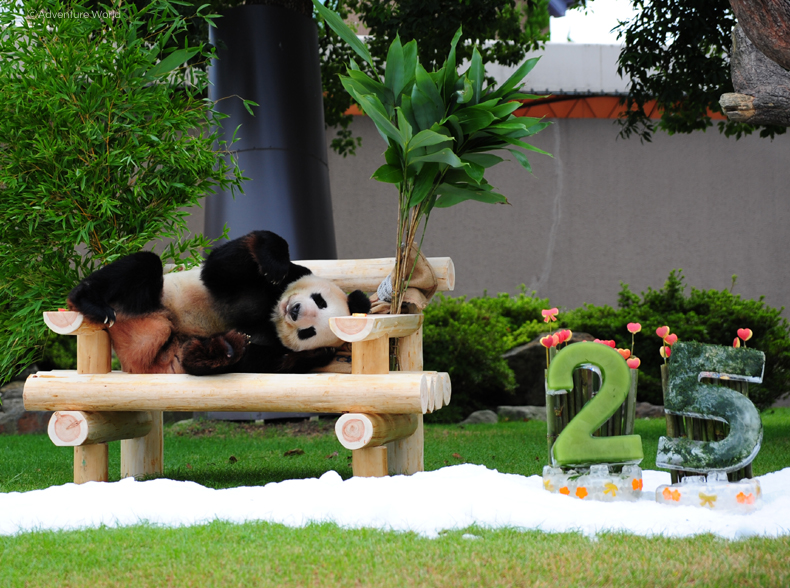 「永明(えいめい)」は1994年9月6日に中国から来園し、初代お母さんパンダ「梅梅(めいめい)」(メス・2008年永眠)との間に6頭、2000年にアドベンチャーワールドで生まれた「良浜(らうひん)」(メス・17歳)との間に8頭、計14頭の子どもが誕生しました。2014年にふたごのジャイアントパンダ「桜浜・桃浜(おうひん・とうひん)」が誕生した際「飼育下で自然交配し、繁殖した世界最高齢のジャイアントパンダ」となり、2016年にパンダの赤ちゃん「結浜(ゆいひん)」が誕生した際にその記録が更新されました。