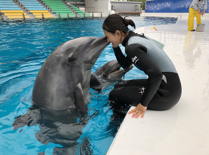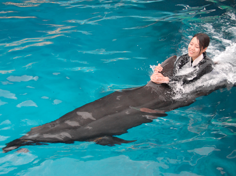 イルカに魚をあたえ、イルカとのキスや背びれにつかまりプールを一周泳ぐなど、アドベンチャーワールドの体験アトラクションの中で、イルカとの距離が最も近く、長くイルカとの時間を過ごすことができます。