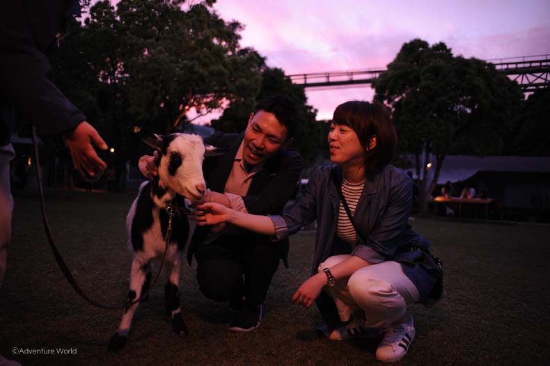 夜のふれあい広場に動物たちが大集合。アルパカやミニチュアホースなどかわいい動物たちとの、心癒される時間。