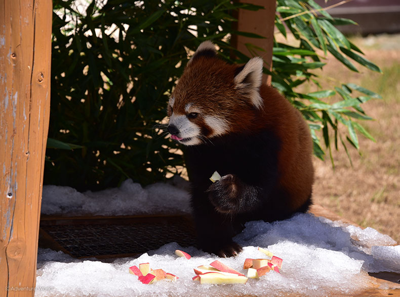 運動場に登場したレッサーパンダ、最初は大量の雪と足の冷たさのせいか、少しびっくりしていましたが、雪と笹でデコレーションした小屋「真夏のクールハウス」で、好物のリンゴを食べ、くつろぐ様子が見られました。
