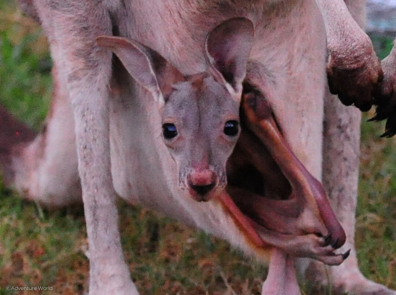 アドベンチャーワールドでは、アカカンガルーの赤ちゃんが誕生し、お母さんのおなかの袋で成長した赤ちゃんが7月上旬より顔を出し始めました。今回生まれた赤ちゃんは、2018年2月に熊本市動植物園より仲間入りした、オスとメスの間に誕生しました。体長が約2cmの大きさで生まれるため、出生時の確認は行わずそっと見守ってきました。順調に成長し最近は夕方の涼しい時間帯に母親のお腹の袋から顔を出すことが増えてきました。