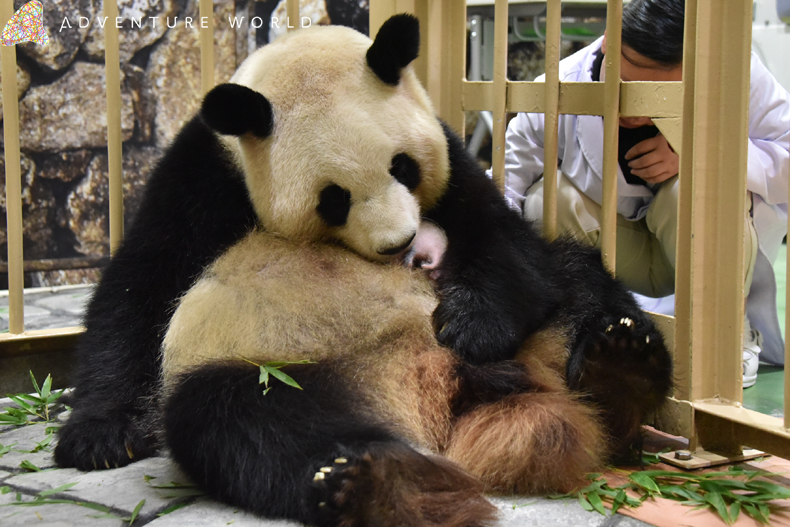 アドベンチャーワールドで最も小さく生まれた赤ちゃんと母親「良浜(らうひん)」をスタッフが24時間体制で注意深く見守っています。体の毛が伸び始め、生まれたときはピンク色だった容姿から白い部分がはっきりとし始めました。