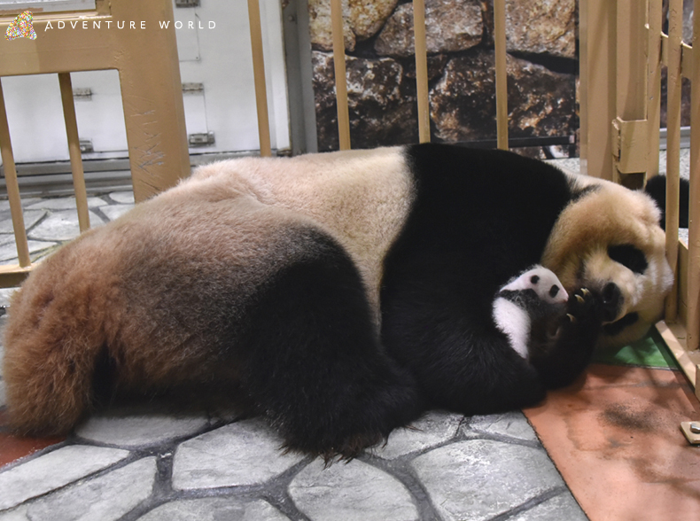 お母さんパンダは赤ちゃんの排泄を促したり、体をきれいにするために、抱きながら舐める姿がよく見られます。そのため愛情たっぷりに赤ちゃんを舐めることで赤ちゃんの毛の色がほんのりピンク色になります。