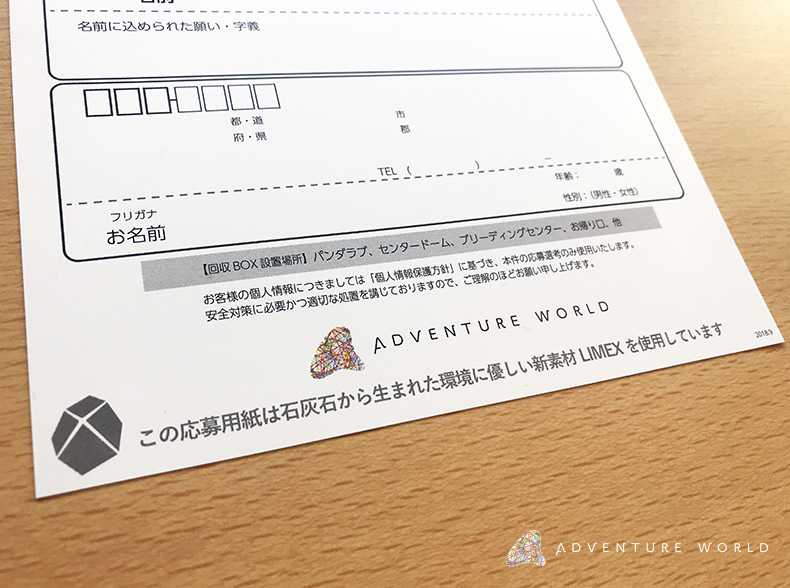 アドベンチャーワールドは、パークテーマ「こころにスマイル 未来創造パーク」のもと、より良い社会を未来へと贈り継ぐために、株式会社TBM(本社:東京都中央区)が開発、製造、販売する、石灰石を主原料とし、木材パルプを一切使用しない、紙やプラスチックの代替となる新素材「LIMEX(ライメックス)」を、ジャイアントパンダの赤ちゃんの名前応募用紙として導入いたしました。(2018年10月6日導入)