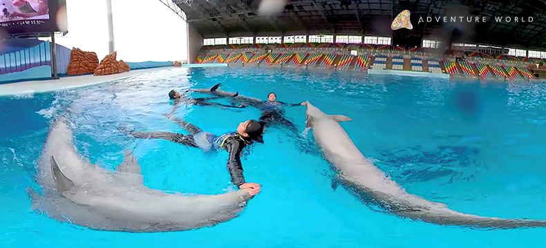 トレーナーの目線でイルカたちの迫力あるジャンプを間近で体験し、イルカたちと一緒に泳ぐ感覚をお楽しみいただけます。