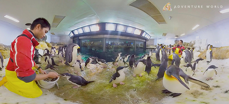 「Adventure World VR」は、今年8月14日に誕生したジャイアントパンダの赤ちゃんと、母親「良浜(らうひん)」の子育ての様子や、15頭の父親となった父親「永明(えいめい)」など、ジャイアントパンダファミリーの様子を、飼育スタッフの目線で360度体験できるVRサービスです。その他、イルカたちのパフォーマンス「マリンライブ」やペンギンたちが暮らす世界もVR体験コンテンツとしてお楽しみいただけます。