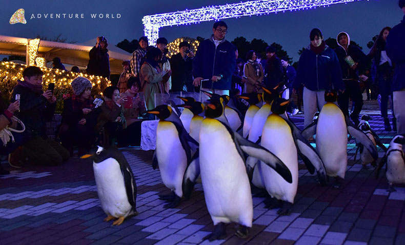 キングペンギン、ケープペンギン、ジェンツーペンギンがイルミネーションで彩られたフラワー通りを  大行進!