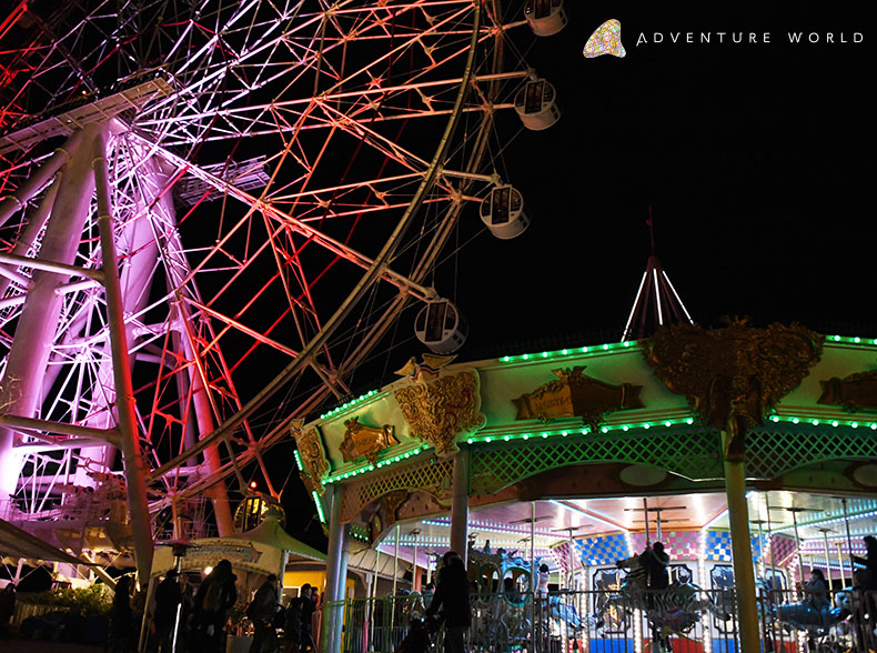 夜空に彩りを添える、メリーゴーランドや9種の乗り物が華やかなアトラクションに。