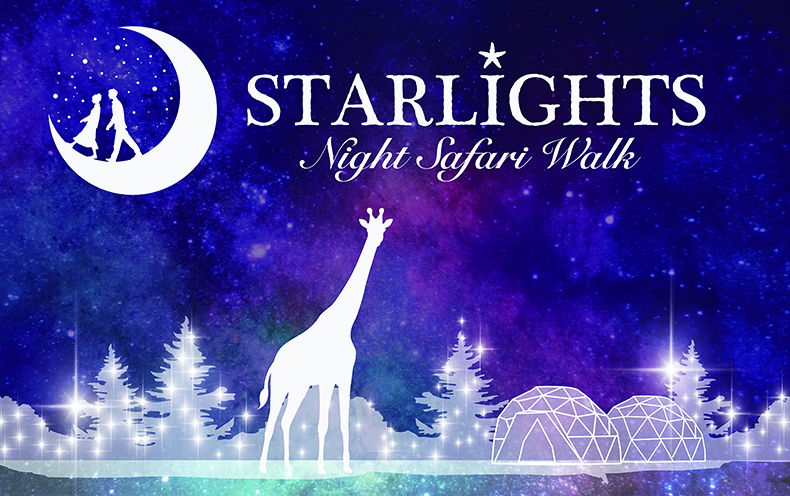 サファリワールドのキリンテラスに向かうウォーキングコースが「スターライツ ナイトサファリウォーク」として、ウィンターナイト限定の体感アトラクションに。幻想的な光・音・映像をミックスした体感型イルミーネーションとラグジュアリーなテントやクリアドーム型のテントを展開。