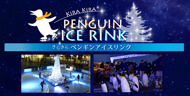 ファミリー広場にウィンターナイト期間限定で「アイスリンク」が登場。このアイスリンクエリアには、キングペンギンなど4種類20羽のペンギンたちを展示。夜には、ライトアップされ、リンク中央のシンボルツリーがきらきらと輝く幻想的な空間で、アイススケートをお楽しみいただけます。