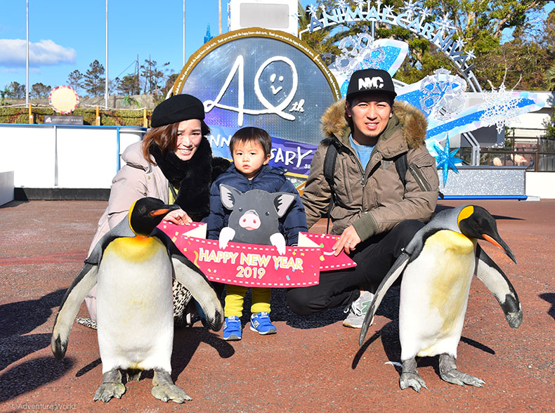 「NEW YEAR WELCOME 2019」では、イヌ、アルパカ、カワウソ、キングペンギン、ベニコンゴウインコ、ミニブタ、ミニチュアホース等、たくさんの動物たちがフラミンゴ広場に集まりました!!