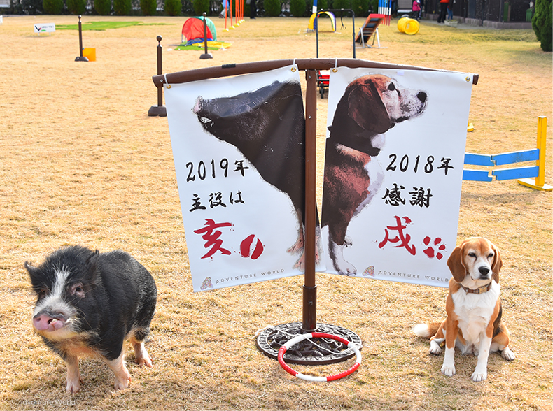 昨年の干支「戌」と今年の干支「亥」にちなみ、犬とミニブタ(イノシシ科)とゲストで猪突猛進トントンレースを行いました!