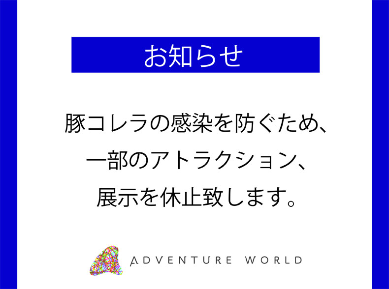 2月6日(水)に愛知、大阪、長野、岐阜、滋賀の5府県の養豚場で豚コレラの感染が確認されたことを受けて、アドベンチャーワールドでは、感染を防ぐため、一部のアトラクション・展示を休止致します。