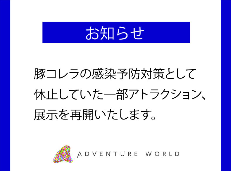 近畿における豚コレラの感染・発症が拡大していないことから、アドベンチャーワールドでの感染予防対策を解除いたします。