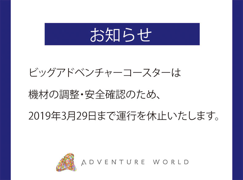 ビッグアドベンチャーコースターは、機材の調整・安全確認のため、本日(3月26日)から2019年3月29日(金)まで運行を休止いたします。