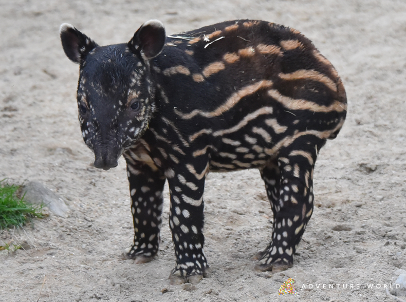 現在、赤ちゃんは乾草や果実も徐々に食べるようになってきており、非常に好奇心旺盛です。マレーバクは、体の色が白黒2色にはっきりと分かれているのが特徴的ですが、生まれたばかりの赤ちゃんはイノシシの子どものように茶色に白い縞模様と斑点が特徴的です。マレーバクの親子はサファリワールド内マレービレッジでご覧いただけます。赤ちゃんの成長を温かく見守ってください。