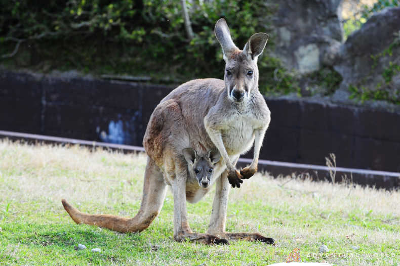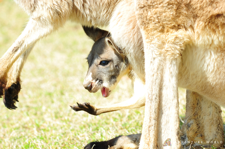 アドベンチャーワールド(和歌山県白浜町)では、アカカンガルーの赤ちゃんが誕生し、お母さんのおなかの袋の中で成長した赤ちゃんが2019年2月初め頃から顔を出し始めました。体長が約2cmの大きさで生まれるため、出生時の確認は行わずに、見守ってまいりました。順調に成長し、最近は午前中に母親のおなかの袋から顔を出すことが増えてきました。アカカンガルーの親子はサファリワールドのオーストラリア区にてご覧いただけます。