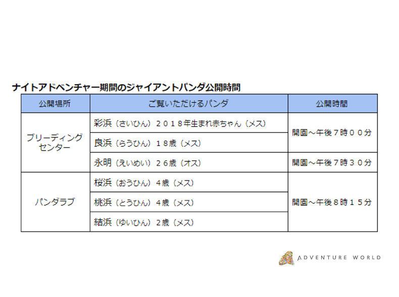 アドベンチャーワールド(和歌山県白浜町)ではゴールデンウィーク期間(4月27日〜5月6日)午後8時30分まで営業時間を延長し「ナイトアドベンチャー」を開催します。期間中はジャイアントパンダの赤ちゃん「彩浜(さいひん)」を午後7時まで特別公開いたします。