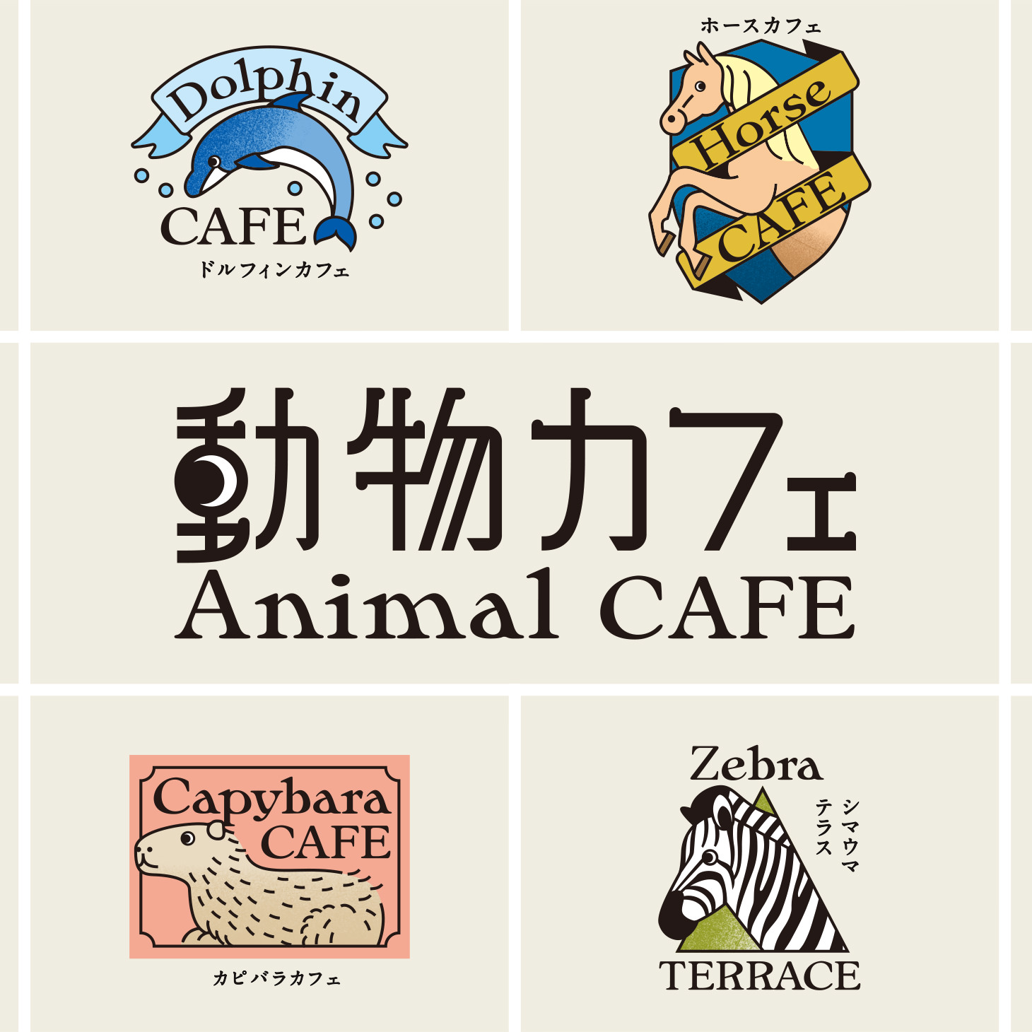 フラミンゴカフェ、ペンギンカフェ、シマウマテラス、マレーバクテラス、ドルフィンカフェ、フタコブラクダカフェ、カピバラカフェ、リスザルカフェ、カバカフェ、ホースカフェ。