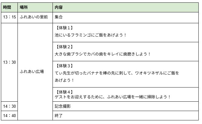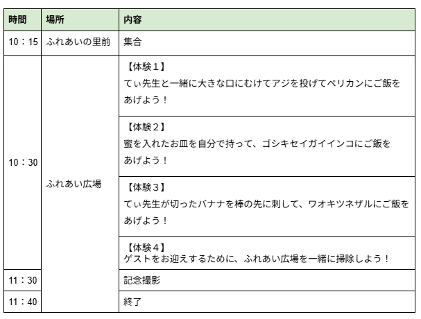 ※動物の体調や天候などにより、内容を変更及び中止させていただく場合がございます。