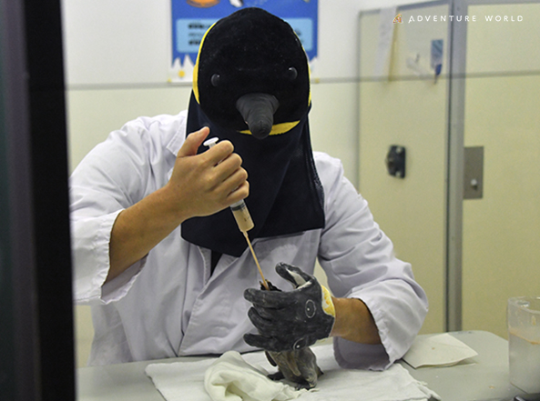 本日の体重は、248g!アドベンチャーワールドでは、赤ちゃんの体に力が付き始める体重約600gまでスタッフが親鳥になりきり、録音した親鳥の鳴き声を聞かせながら食事を与える「初期人工育雛」で大切に育てます。